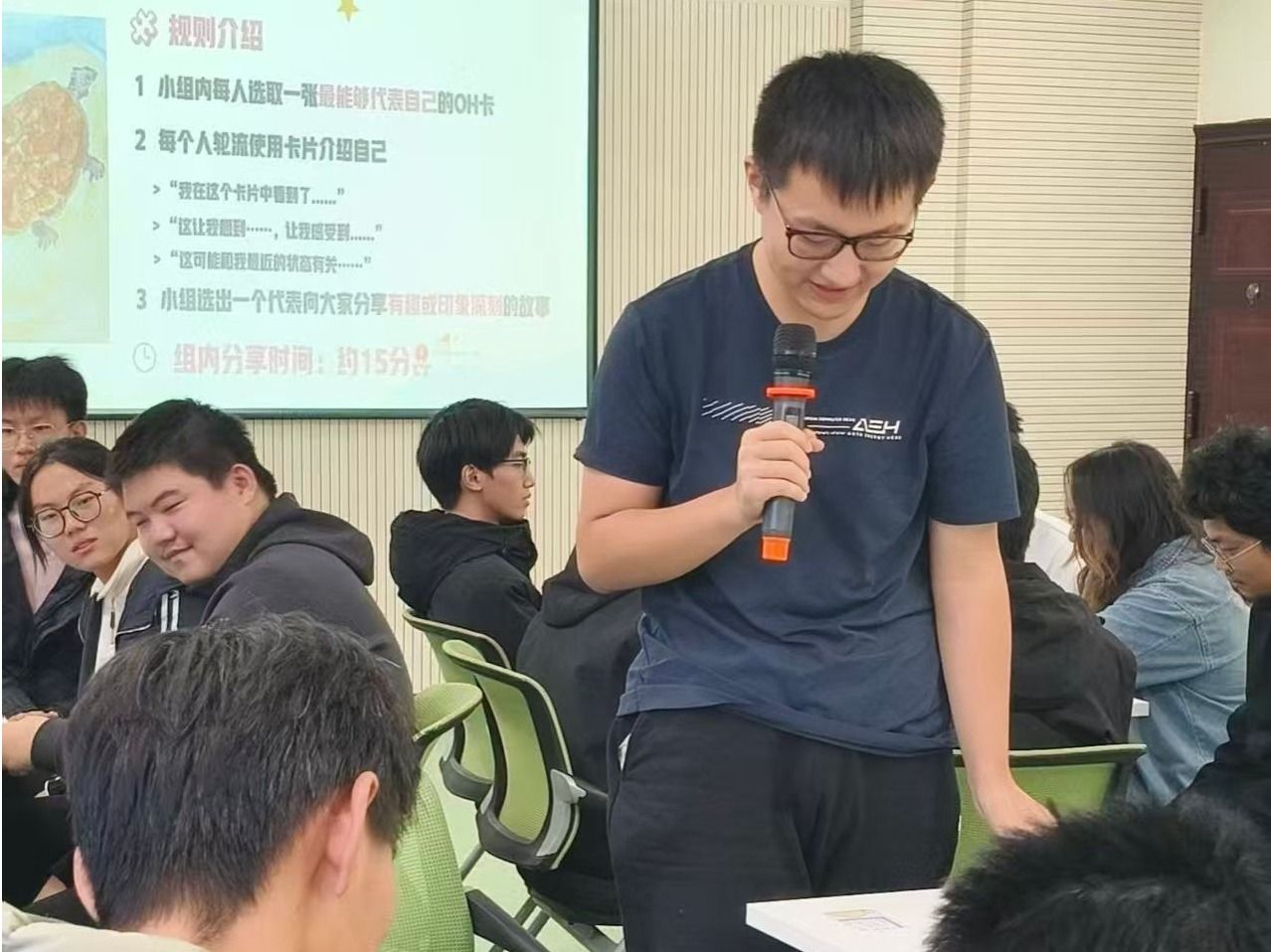 在接下来的核心环节,郭老师围绕“个体-协作-默契”依次展开活动。“OH卡自我介绍”“默契大比拼”“真人扫雷”等环节,既建立小组内部信任与理解、促进情感表达,又增强了小组凝聚力和协调能力。